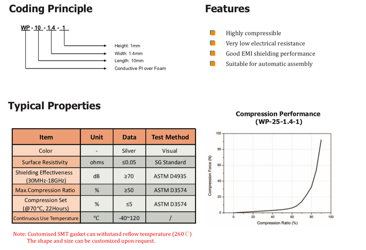 TM WP系列導電PI覆蓋泡棉材料由高導電性的Cu/Ni鍍層PI、PU泡棉組成 芯和導電壓敏丙烯酸粘合劑。這些高度可壓縮的材料 設計用于提供卓越的EMI屏蔽和接地性能,并且防塵和 防潮。WP系列產(chǎn)品很容易縮小尺寸,特別適用于計算機內(nèi)的固定墊圈應用, 智能手機、液晶顯示器/電視和電信制造業(yè)。 可根據(jù)要求定制回流焊墊片。" />