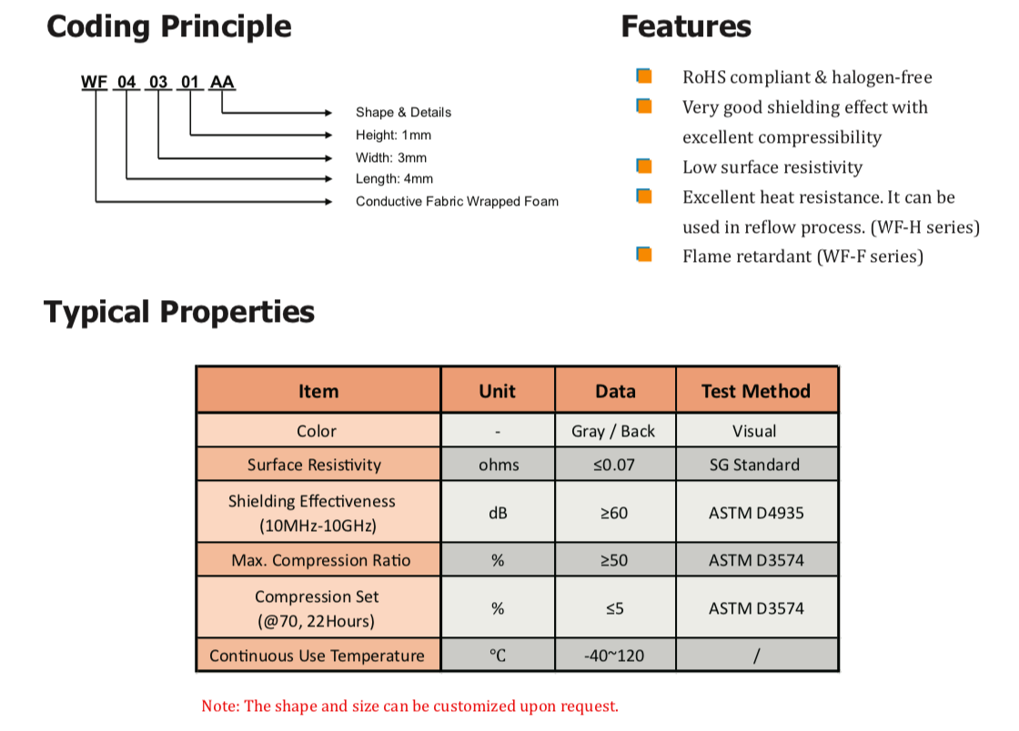 TMWF系列導(dǎo)電布包裹泡棉由高導(dǎo)電布、PU泡棉芯和導(dǎo)電壓敏丙烯酸粘合劑組成。這些高度可壓縮的材料專門設(shè)計(jì)用于提供卓越的EMI屏蔽和接地性能,并且可以提供優(yōu)秀的防塵和防潮保護(hù)。WF系列產(chǎn)品極易調(diào)整尺寸,適用于計(jì)算機(jī)、智能手機(jī)、液晶顯示器和電信制造行業(yè),如固定墊圈。" />